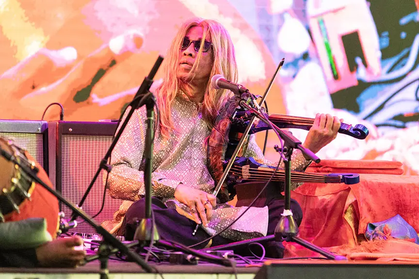 This year’s version had did have a more traditional lean than previous ones. There were fewer East-West hybrids, much less in the way of electronics, no raga-metal (unfortunately!). There were established masters like violinist Charumathi Raghuraman, vocalist Priya Purushothaman, and sitarist Shahid Parvez, and rising stars like tabla player Ishaan Ghosh. Violinist Arun Ramamurthy was back with his excellent jazz trio (you can hear this group on a fine 2024 Greenleaf release, New Moon), and “Mandolin” U. Rajesh played traditional music on his modern, electric, Western instrument. Sitarist Purbayan Chatterjee dropped a cheeky reference to the Get Smart theme and interpolated Chick Corea’s “Spain” into his set.