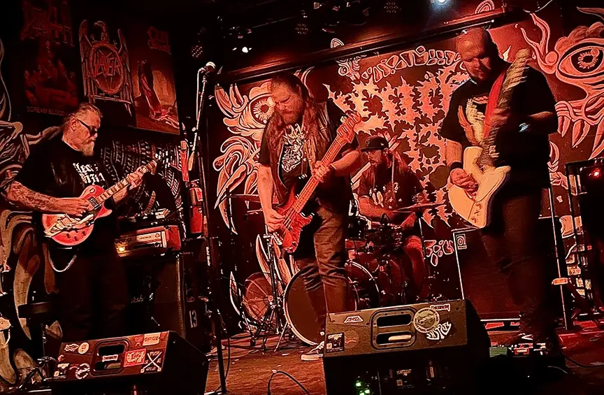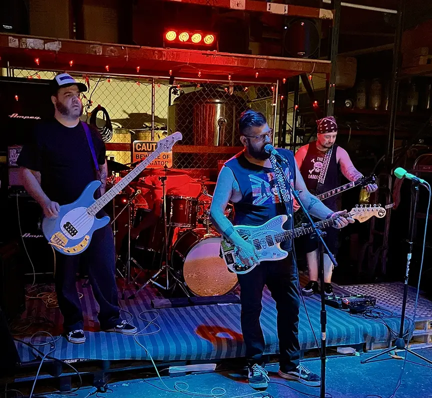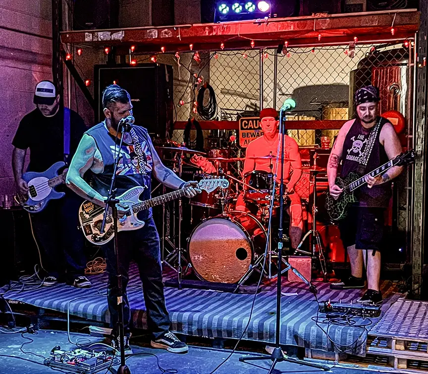 As I enter the venue, after having to show ID at the door I am greeted with a wide variety of beverages, including quite a few non-alcoholic options and ear plugs! Making my way to the back, I part the curtains and enter the metal lair for the first band, The Green Hog Band. Green Hog Band is a Brooklyn based band founded in 2019 by father son duo Mike (guitar) and Ivan (bass/vocals)Antipov, which now includes long time friend Art (guitar) and keeping the beat heavy is Bill (drums). The band’s sound was tight, loud and they were smiling at each other most of the time, obviously enjoying every minute. Ivan was center stage, not the norm for the bass player but with his growling vocals, front and center was where he should be. Flanked by Mike stage left and Art stage right, these three guitarists brought the audience inside and house down. How Bill kept up on drums is beyond me, he was a blur of sticks, faster than the speed of sound.